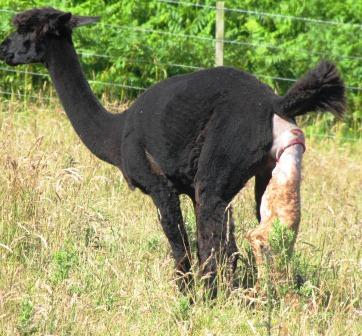 When I got there, stood, yes stood, in front of the quad was a lovely dark fawn cria! She couldn't have been further up the particular field than she was, Paul said she was kushed when he got to her. I scooped her up and yelled Mallika who came running, we met half way and the reception was fantastic.